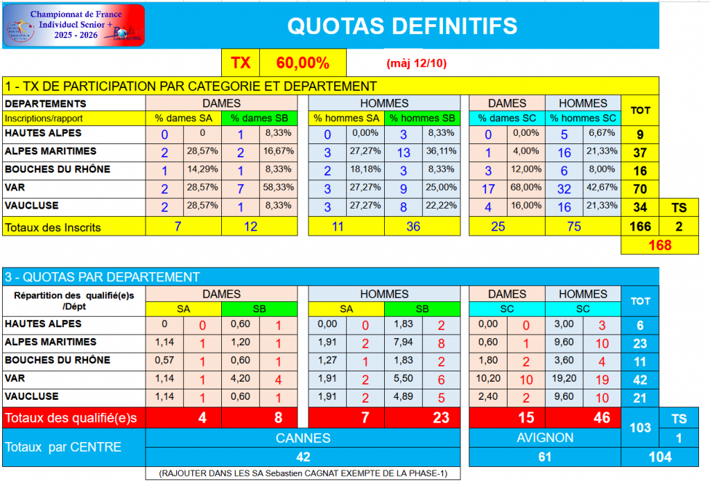 Attention, les quotas pourront être modifiés à l’issue de la compétition, et mis à jour en corrélation avec la participation.